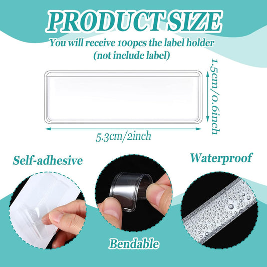 Jeyiour 100 Pcs Label Holders Adhesive Nameplate Pockets Storage Bin Labels Index Card Holder Shelf Plastic Peel Stick for Classroom Supermarket Bookshelf Library Student Box Drawer (3.6 x 2.9 Inch)
