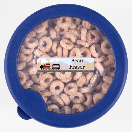 Name Bubbles - Custom Small Rectangle Name Labels for Kids (64 Labels) - Personalized Waterproof Name Stickers for Daycare, Lunch Boxes, Water Bottles, Shoes, School Supplies, & Camp (Train)