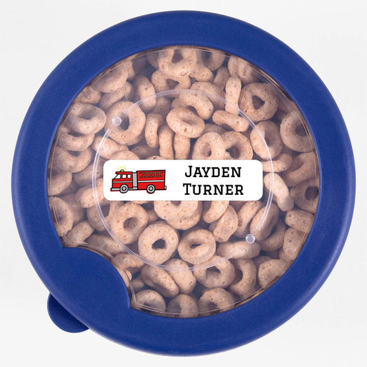 Name Bubbles - Custom Small Rectangle Name Labels for Kids (64 Labels) - Personalized Waterproof Name Stickers for Daycare, Lunch Boxes, Water Bottles, Shoes, School Supplies, & Camp (Fire Truck)
