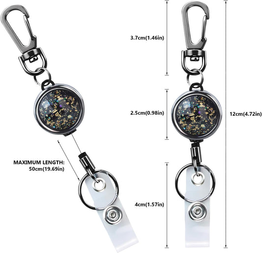 bolimoss Bling Black Retractable Badge Reels with Key Ring and Carabiner Belt Clip, Glittery Metal Retractable Keychain for ID Cards Name Holder Nurse, Teacher, Students (3 PCS)