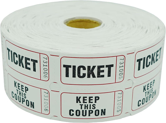 DNB 1000 Raffle Tickets - Double Roll 1000 Pairs per Roll 2 x 2 Inch 50/50 Consecutively Numbered Tickets for Entry/Events/Fundraiser/Prizes - White
