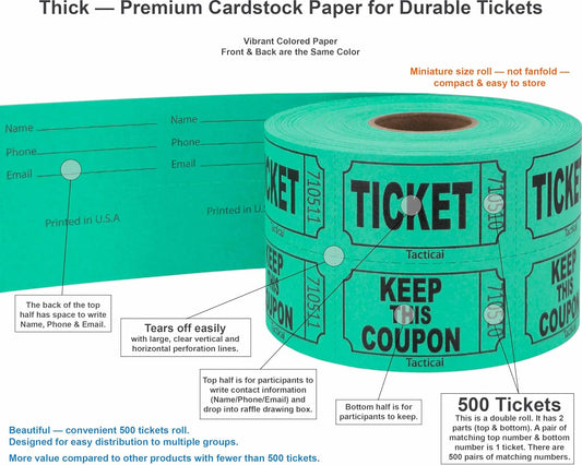 Tacticai 500 Raffle Tickets, Green (1 of 8 Colors), Double Roll, Ticket for Events, Entry, Class Reward, Fundraiser & Prizes