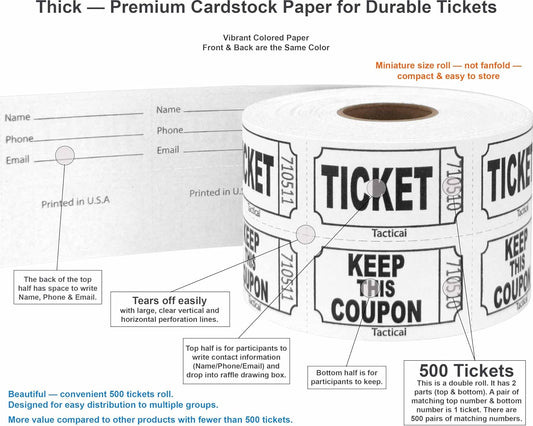 Tacticai 500 Raffle Tickets, White (1 of 8 Colors), Double Roll, Ticket for Events, Entry, Class Reward, Fundraiser & Prizes