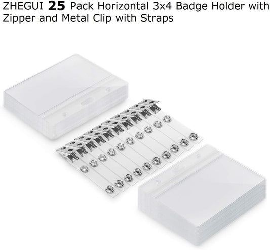 Clear Plastic Horizontal Name Tag Holders and Metal Badge Clips with Vinyl Straps Waterproof PVC ID Card Badge Holder 3x4 Inch(25 Pack, Horizontal Large 3x4)