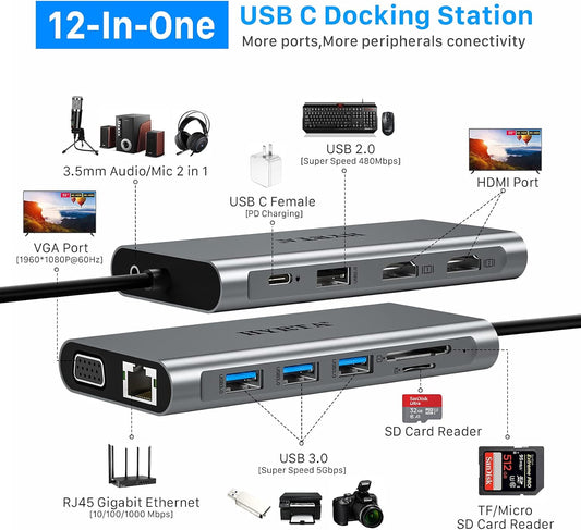 USB C Docking Station,12 in 1 Displaylink USB 3.0 to USB-C Dock Dual Monitor with HDMI,VGA,USB A 3.0,PD3.0, Laptop Docking Station for MacBook Pro&Air/M1/M2/M3/HP and More USB Ports Laptops