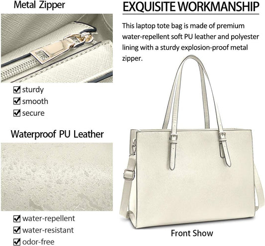 Laptop Bag for Women Waterproof Lightweight Leather 15.6 Inch Computer Tote Bag Business Office Briefcase Large Capacity Handbag Shoulder Bag Professional Office Work Bag Beige