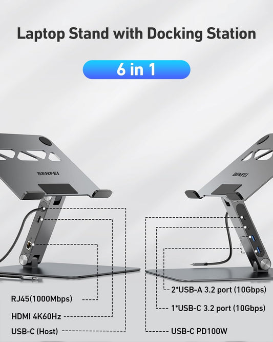 BENFEI Laptop Stand with USB C 6in1 Docking Station, HDMI 4K@60Hz,Gigabit Ethernet, 100W Power Delivery, 10Gbps 1*USB C 3.2 and 2*USB A 3.2 Compatible with MacBook Pro/Air, iPad Pro, XPS, Thinkpad
