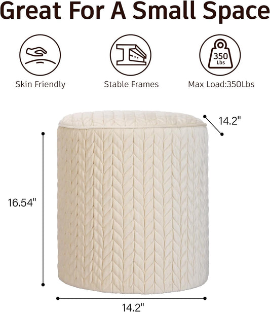 Modern Round Ottoman, Braided-Tufted Foot Stool Ottoman, Velvet Upholstered Vanity Stool for Makeup, Bedroom, Living Room, White