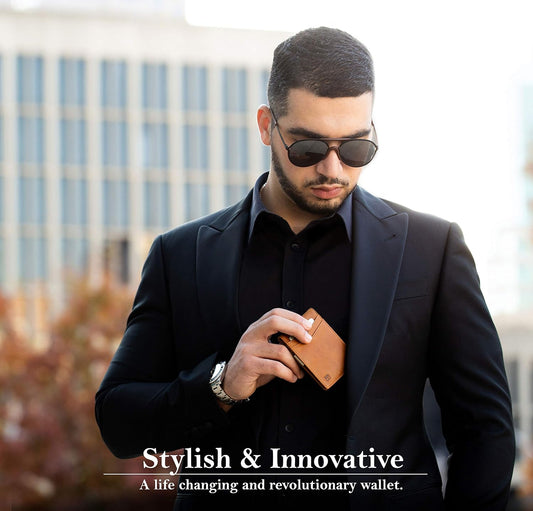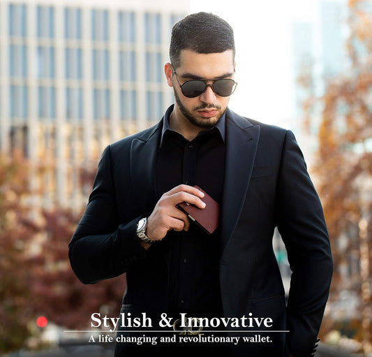 Airtag Wallet for Men,with Money Clip Gift Boxed,Slim Front Pocket Wallet RFID Blocking Metal Case Smart Pop-up Credit Card Holder in Magnetic Leather Flip