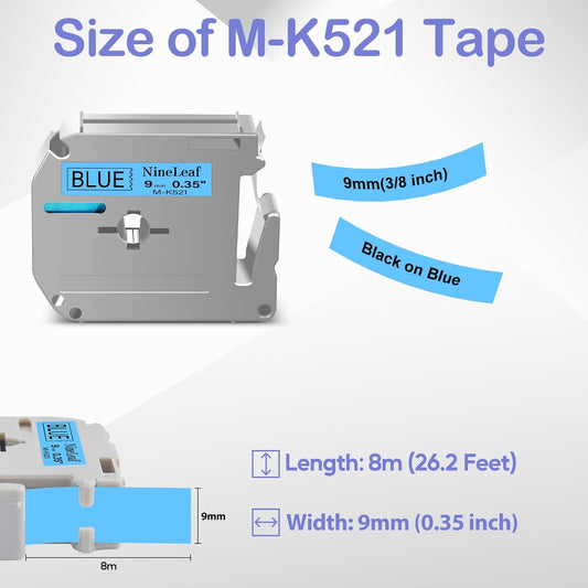 NineLeaf 4 Pack Compatible for ptouch M Label Tape MK521 M-K521 M521 Black on Blue 3/8" (9mm) x 26.2ft (8m) Labeling Refill Cartridge Work in PT-45M PT-65 PT-70 PT-80 PT-M95 Label Maker