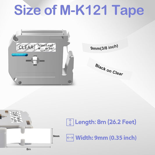 NineLeaf 4 Pack Compatible for Brother P-Touch M Label Tape MK121 M-K121 M121 Black on Clear 3/8" (9mm) x 26.2ft (8m) Labeling Refill Cartridge Work in PT-45M PT-65 PT-70 PT-80 PT-M95 Label Maker