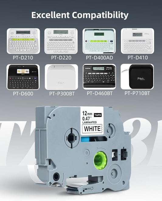 8Pack Compatible with Brother P Touch Label Tape 12mm 0.47 Laminated White TZe-231 TZe 231 TZe TZ Tape Refill Compatible with Brother P-Touch Label Maker PT-D210 PT-H110