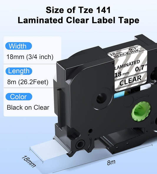Tze-141 18mm 0.7inch Laminated Clear Tape Compatible for Brother PT-D400 Label Maker Tape Clear, TZ-141 Tze 18mm 3/4inch for Brother P-Touch PT-D600, PT-D410, PT-D610BT Label Maker, 5 Pack