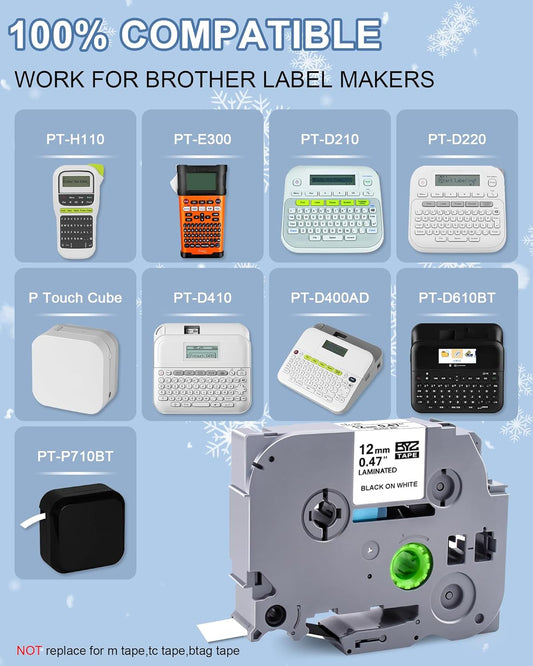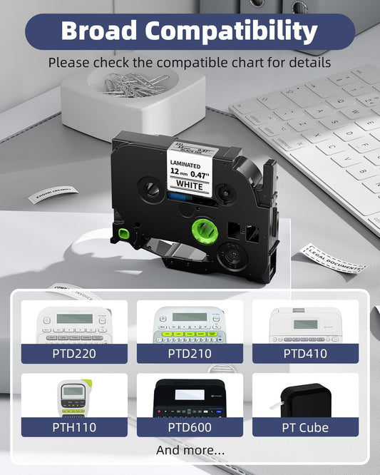 12mm 0.47 Laminated White Tape Tze Tz Label Compatible with Brother P-touch 1/2 Inch Black on White P Touch Label Maker TZe231 for PT-D210 1280 1750 PT-P300BT PT-P700BT Cube Plus Tape, 10-Pack