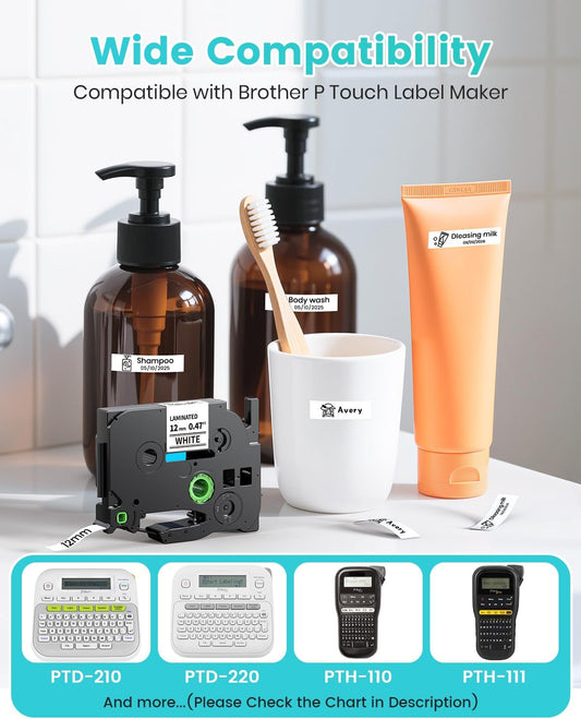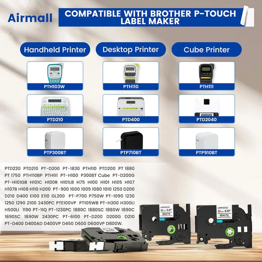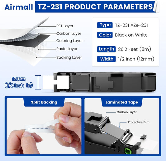 Airmall Tze 12mm 0.47 Laminated White Label Maker Tape Refill Compatible with Brother 12mm .47 Laminated White Tz Tape TZe-231 TZ-231 for PT-D200 D210 D220 H110 D410 P710BT 1750 1180, 12Pack