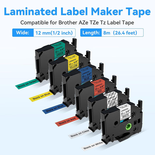 Compatible with Brother Label Maker Tape Refill Multi Color Tze TZ Tape 12mm 0.47" Laminated TZe 131 231 431 531 631 731 Replacement for Brother P-Touch PT-D210/D220/H110/D410 Label Makers, 6PK