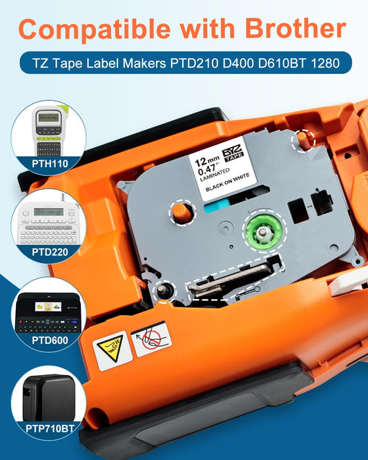 Tze TZ Tape 12mm 0.47 Laminated White Tape Compatible for Brother Label Maker Tape 12mm 1/2" Black on White Tape for Ptouch PT PTD200 PTD410 D210 D220 D610 P710BT PTH110, 5-Pack