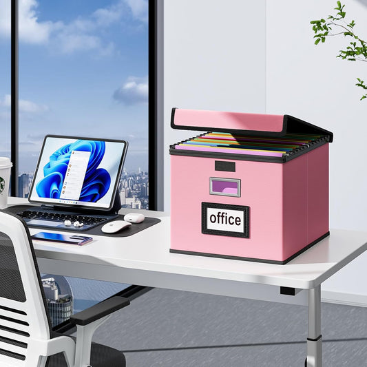 Huolewa File Organizer Box with Lid, Collapsible Leather File Folder Organizer for Office Document Storage, Filing Box with Plastic Slide for Letter/Legal Size Hanging Files, Pink