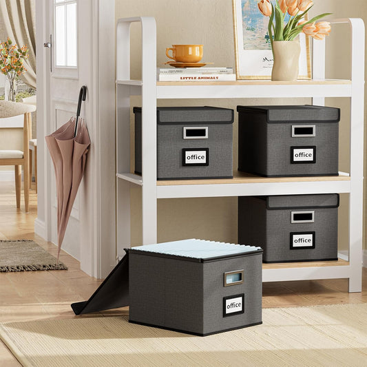 File Organizer Box, Decorative Storage Filling Box with Lid for Letter Legal Size Hanging Folders Collapsible Linen File Folder Box Office Document Storage Filing Bin, Dark Gray 4 Pack