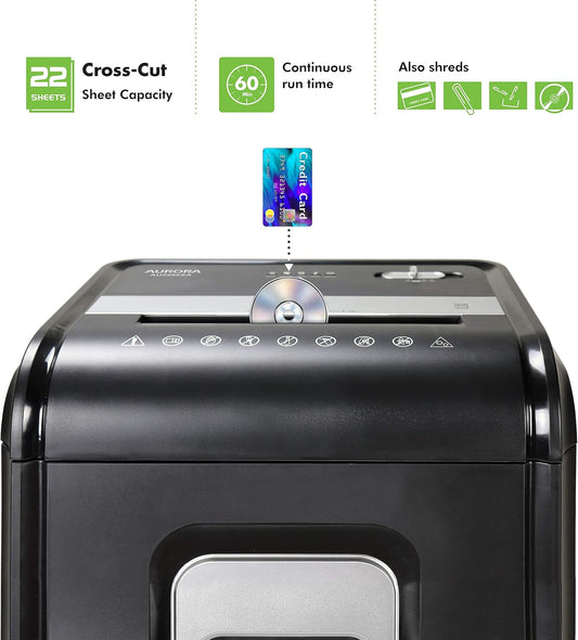 Aurora AU2260XA Heavy Duty Anti-Jam 22-Sheet Crosscut Shredder/60 Min Run Time/ 7-Gallon Pullout Basket and Casters