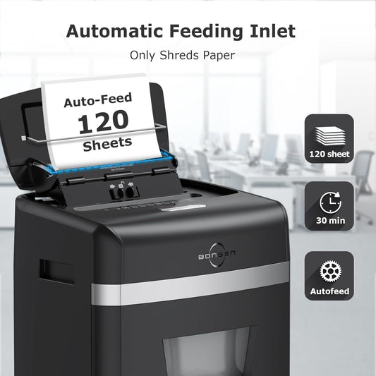 BONSEN Shredder for Office, 120-Sheet Auto Feed Paper Shredder, Micro Cut Paper Shredders for Home Office Use, 30 Minutes/High Security Level P-4/6 Gallon Bin (S3110)