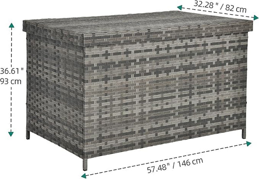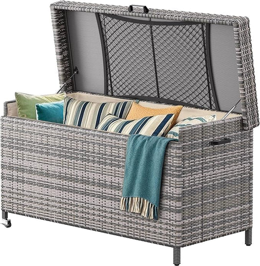 YITAHOME 200 Gallon Large Wicker Deck Box w/Storage Net, Rattan XL Outdoor Storage Box Patio Cushion Storage, Patio Storage Box for Garden Tools, Pool Sports Equipment (Grey)