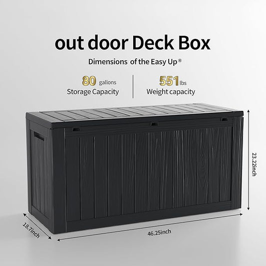 80 Gallon Lockable Resin Deck Box, Waterproof & UV-Resistant Outdoor Storage Box for Outdoor Cushion Storage, Garden Tools & Pool Accessories Storage, Black