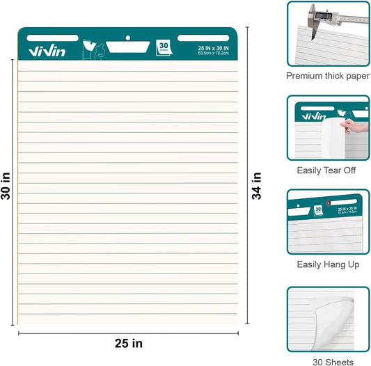 ViVin Lined Sticky Easel Pad, 25 x 30 Inches Flip Chart Paper for Teachers and Students, Large Self Stick Easel Paper, Teacher Anchor Chart, 30 Sheets/Pad, 2 Pads/Pack