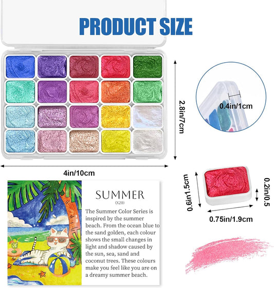 Mini Glitter Watercolor Paint Set, 20 Colors Shimmer Metallic Watercolour Painting Sets, Solid Pearl Water Color Paints for Kids, Adult, 1ml Trial Pack(Summer)