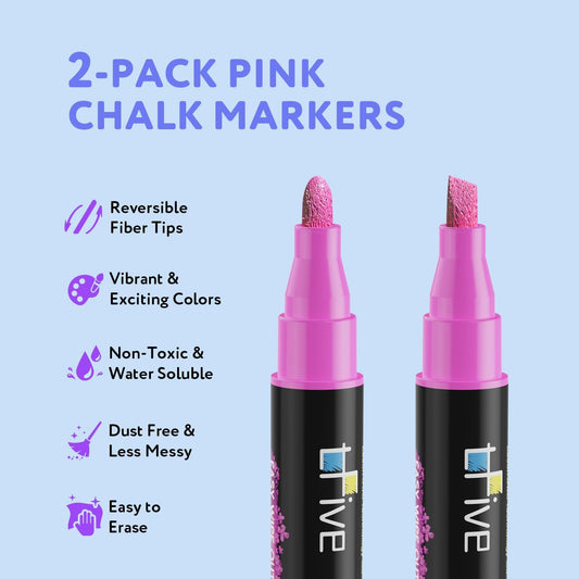 TFIVE Pink Liquid Chalk Markers - 2 Pack Bright Colors Erasable Chalk Marker Pens, Reversible Tip, Non-Toxic, for Chalkboards, Signs, Glass, Easy to use Chalk markers TF800
