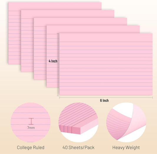 200 Pcs Index Cards 4 x 6 Inch Ruled Pink Index Cards, College Ruled Flash Cards for School, College, Office and Home Organization, Durable Study To Do List Note Cards with Ruled Lines, 5 Pack of 40