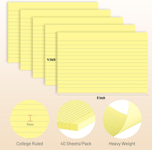 200 Pcs Index Cards 4 x 6 Inch Ruled Yellow Index Cards, College Ruled Flash Cards for School, College, Office and Home Organization, Durable Study To Do List Note Cards with Ruled Lines, 5 Pack of 40