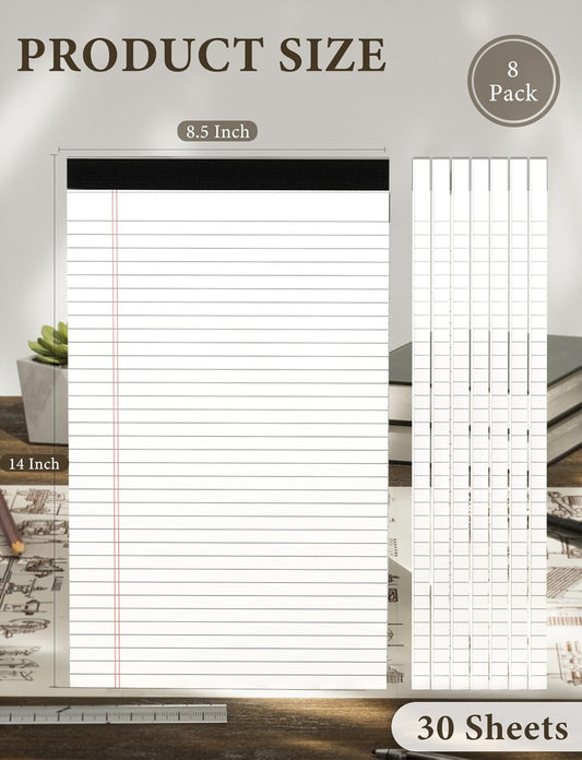 Legal Pads 8.5 x 14 Note Pads, 8 Pack White Paper Pads 8.5''x 14'', Wide Ruled Notebook Pad, Lined Pads of Paper Writing Pads, White Notepads 8.5 x 14, Double Sided, Cardboard Backing, 30 Sheets/Pad
