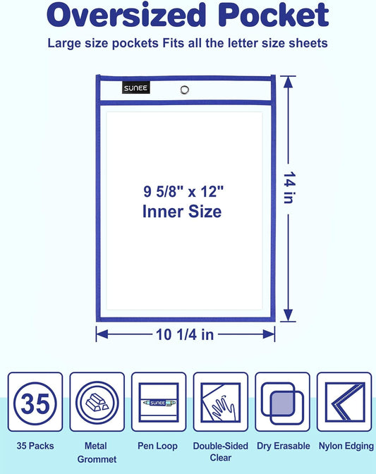 SUNEE 35 Packs Oversized Reusable Dry Erase Pocket Sleeves with 2 Rings, 10 Assorted Colors 10x14 Ticket Holders, Clear Plastic Sheet Protectors, Teacher School Classroom Supplies