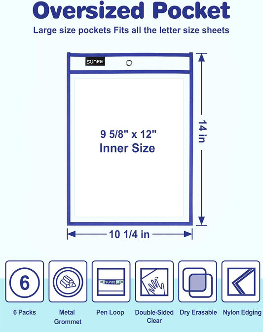 SUNEE 6 Packs Oversized Reusable Dry Erase Pocket Sleeves with Binder Ring, 6 Assorted Colors 10x14 Ticket Holders, Clear Plastic Sheet Protectors, Teacher School Classroom Supplies