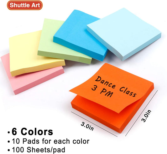 Sticky Notes, Shuttle Art 60 Pads Bright Stickies, 6 Assorted Colors, 3x3 Inches, 100 Sheets/Pad Sticky Pads for Home, School, Office