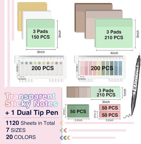 Transparent Sticky Notes,1120 Sheets Clear Sticky Notes with Pen, Waterproof Annotation Kit, Self-Adhesive Translucent Writable Index Tabs for Annotation Books, Bible Journaling Study Office School