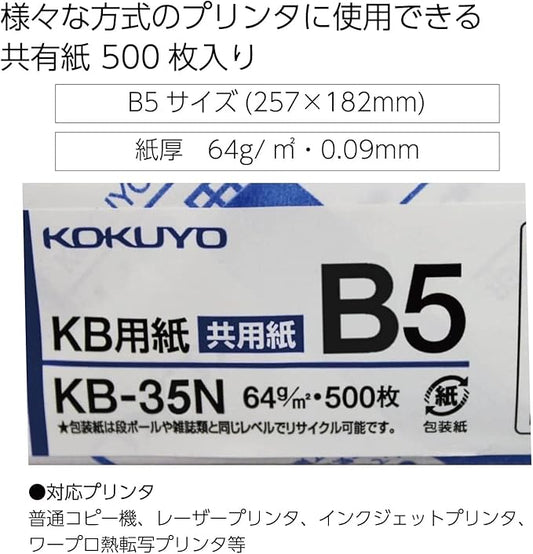 Kokuyo B5 (7.17 x 10.12 inches) KB Paper, 500 Sheets, 64gsm, 80 Bright, 500 Sheets - Perfect for Notebooks/Journals/Academic Writing, FSC Certified, Japan Import (KB-35N)