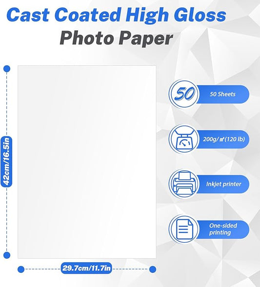 50 Sheets A3 Photo Paper Single Sided, 200 gsm White High Glossy Paper, Advanced Photographic Photo Printer Paper for Inkjet Printer Printing Picture Cover Brochures