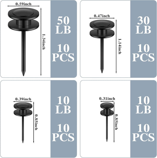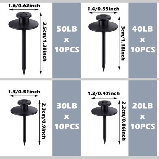40 PCS Picture Hangers Nails 4 Size Long Heavy Duty Thumb Tacks for Wall Double Headed Push Pins Picture Hooks, Renter Friendly Decor Thumbtacks for Tapestry Frame Art Photos,10/20/ 30/ 50lb(Black)