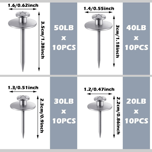 Ferraycle 40 Piece Double Headed Picture Hangers Nails 4 Size Long Thumb Tacks for Wall Hanging Decorative Nails Push Pins Picture Hooks for Drywall Photo Decor, 10/20/ 30/ 50lb(Silver)