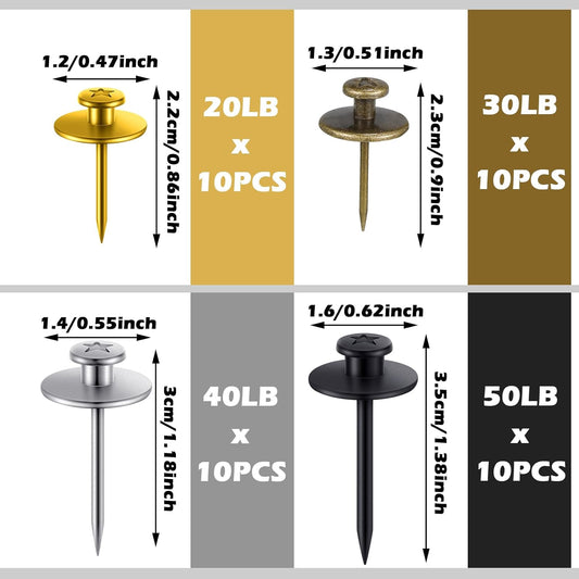 Ferraycle 40 Piece Double Headed Picture Hangers Nails 4 Size Long Thumb Tacks for Wall Hanging Decorative Nails Push Pins Picture Hooks for Drywall Photo Decor, 10/20/ 30/ 50lb(Gold)