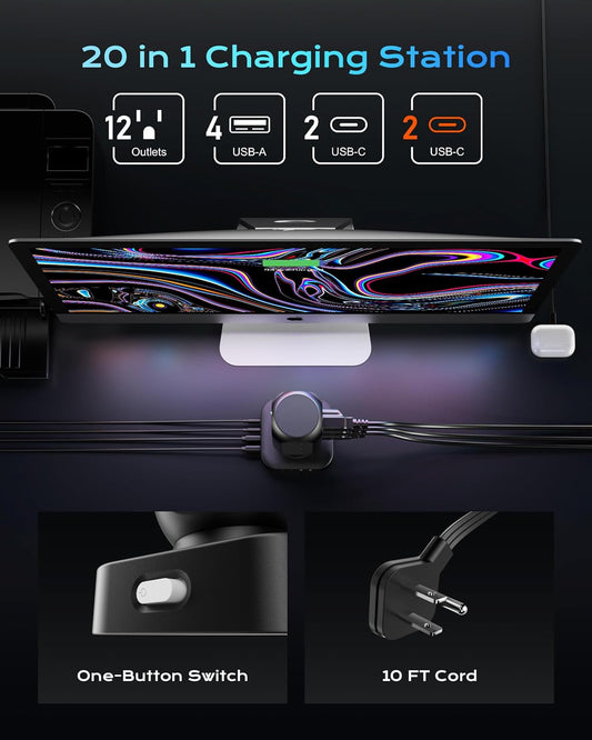 65W Fast Charging Station, Flat Plug Power Strip Tower with 12 AC Outlets & 8 USB Ports (2 PD USB-C Ports), 10FT Extension Cord, Compatible for MacBook Pro, iPhone Series.