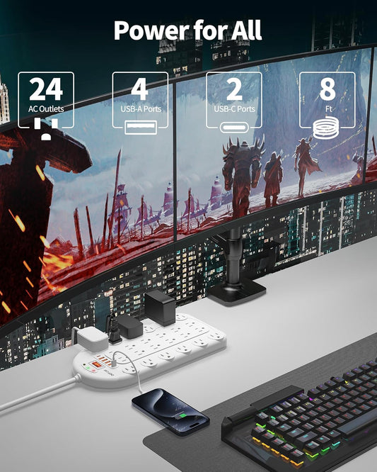 Power Strip, 24 AC Outlets (1875W/15A) with 6 USBs (2 USB-C Ports), ETL Listed, Surge Protector (3,400 Joules), 8 Ft Heavy Duty Flat Plug Extension Cord, Wall Mountable for Home, Office, Black