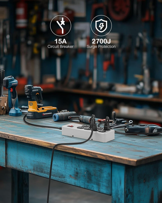 JUNNUJ Heavy Duty 20 Amp Power Strip, Garage 6 Outlets Metal 12 Gauge Surge Protector 3000J, High Amp 5-15P Adapter Shop 6-20R T-Slot Industrial (6AC, 15FT)