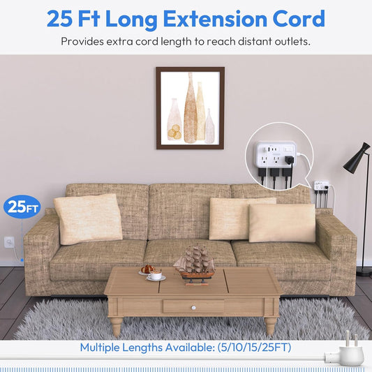 Flat Plug Extension Cord 25 ft, Surge Protector Power Strip, Outlet Extender with 6 Outlets 4 USB Ports, Overload Protection, Long Extension Cord with Multiple Outlets for Indoor, Home, Office, White