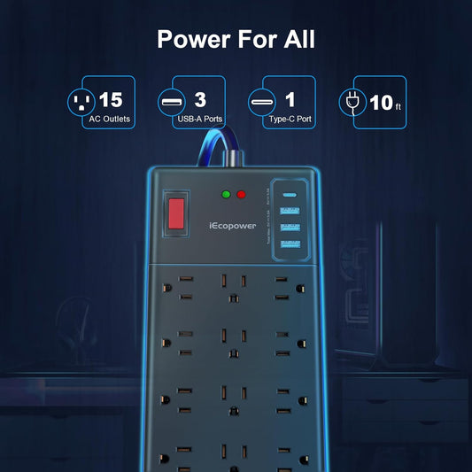AiJoy Surge Protector Power Strip - 12 AC Outlets, 4 USB Ports (1 USB-C), 10ft Extension Cord, Charging Station with Surge Protection for Home, Office, Dorm