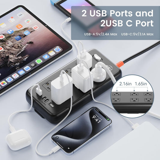 Flat Plug Power Strip, AOFO 5 Ft Extension Cord with 12 Outlets & 6 USB Ports (4 USB-A, 2 USB-C), Surge Protector, Ideal for Home, Office, Dorm, Large Spaces, Reliable and Safe, Black