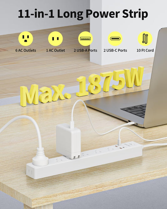 10FT Surge Protector Power Strip,12 AC Outlets with 6 USB Ports (2 USB-C), Flat Plug Extension Cord with Multiple Outlets, Wall Mount for Home Office,Dorm,White
