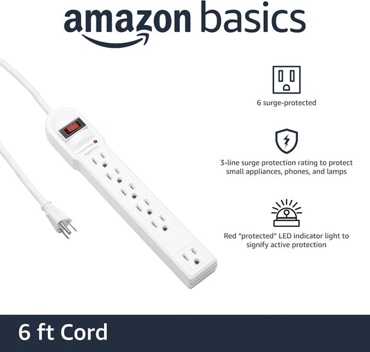 Amazon Basics Surge Protector Power Strip, 6-Outlet, 790 Joules, LED Indicator, 6ft Extension Cord, White
